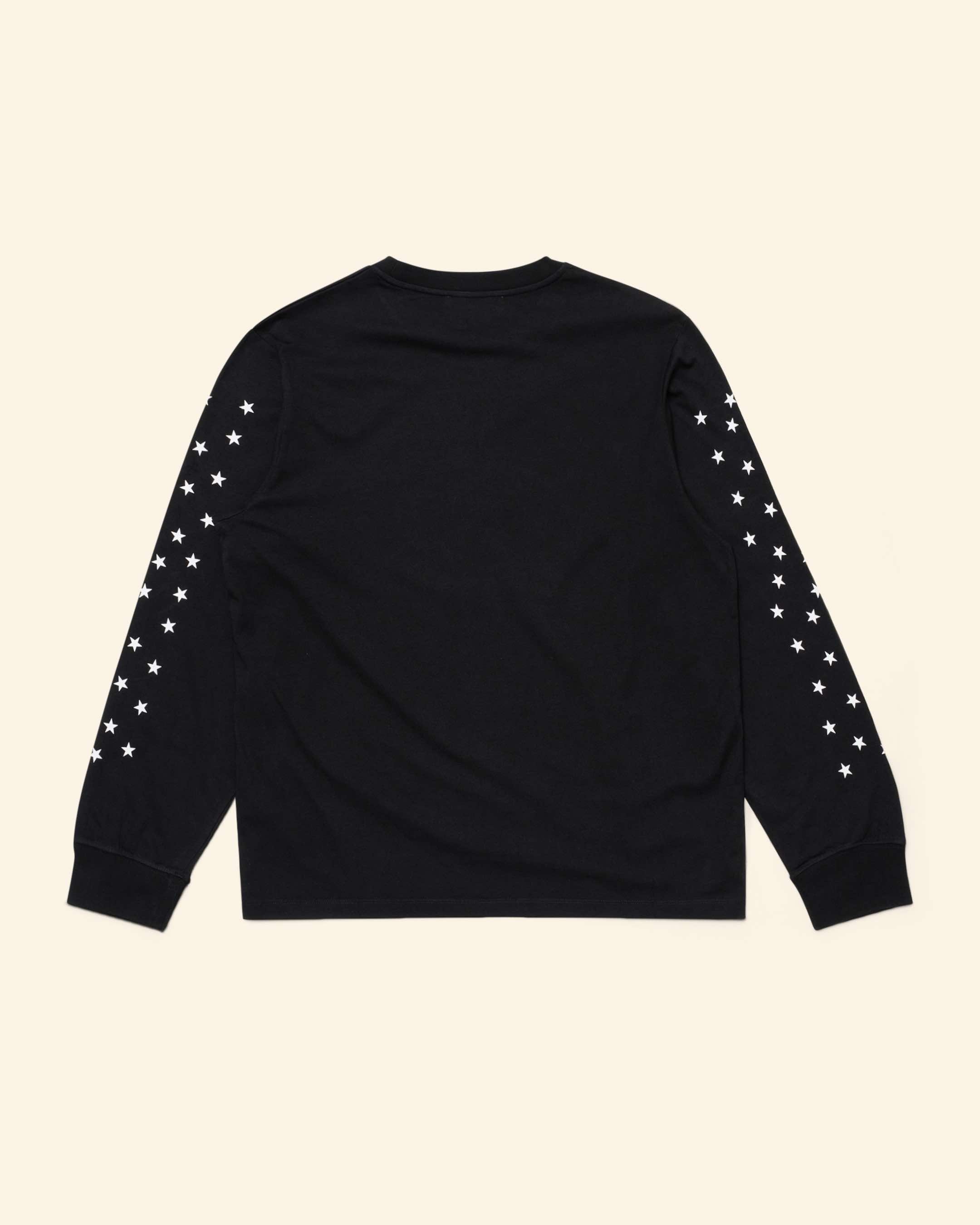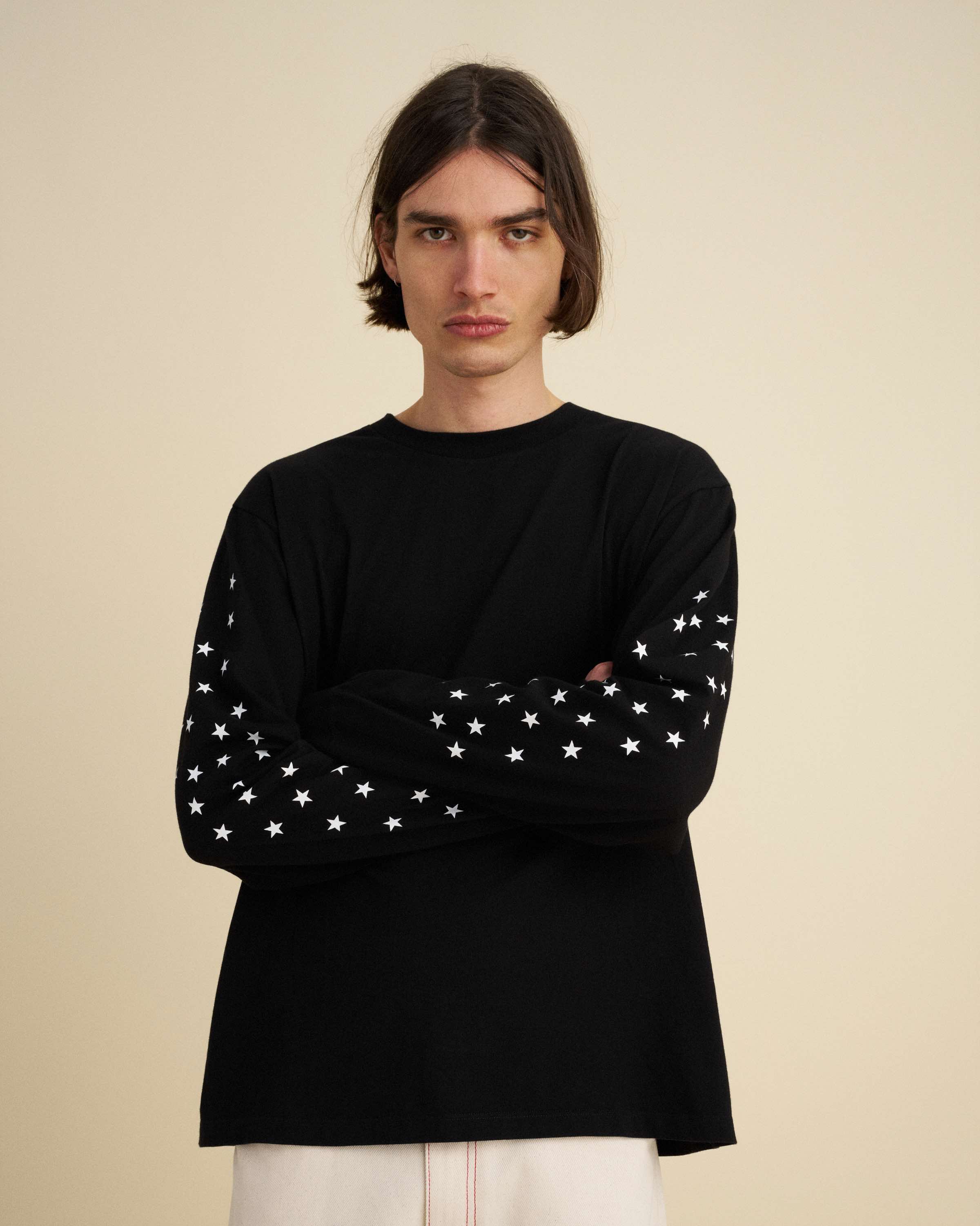 Black long sleeved t-shirt made from 165 g/m 100% cotton jersey – screen-printed with stars print on the sleeves.